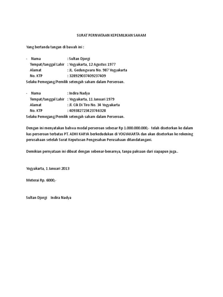 328929037409237409selaku pemegang/pemilik setengah saham dalam. Tentu, karena diucapkan secara tulisan, maka. Surat pelepasan hak kepemilikan kendaraan. Jadi, surat pernyataan bermaterai memiliki dasar hukum. Surat pernyataan kepemilikan sahamyang bertanda tangan di bawah ini :